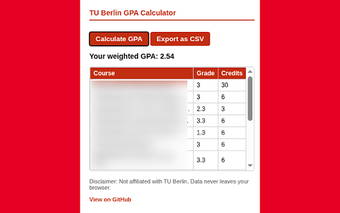 TU 베를린 GPA 계산기는 베를린 공과대학교 학생들을 위해 특별히 설계된 Chrome 확장 프로그램입니다. 이 무료 도구는 사용자가 공식 성적표 페이지에서 직접 가중 GPA를 계산할 수 있도록 하여 학업 계획에 편리한 선택이 됩니다. 이 확장 프로그램은 완전히 오프라인으로 작동하여 사용자의 브라우저에서 데이터가 유출되지 않도록 하여 개인 정보 보호와 보안을 유지합니다.